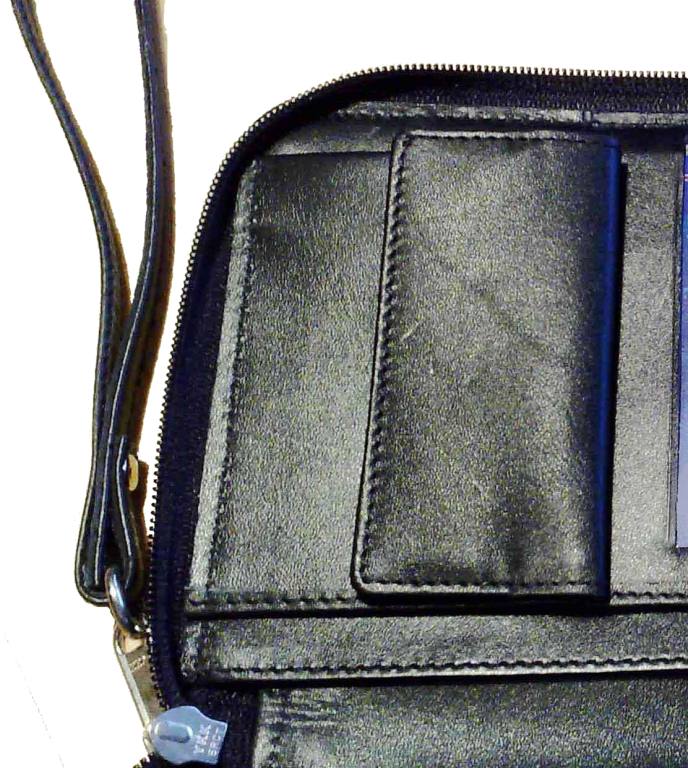 Cows leather. Fully lined. Zip-up closure. 5 deep, full length compartments. 4 slots which can house up to 5 credit cards each. 1 gusseted coin pocket. 1 transparent pocket for ID cards etc. 1 pen holder loop. Approx 9 inches X 5 inches X 0.75 inches (23 cms X 12.5 cms X 2 cms).