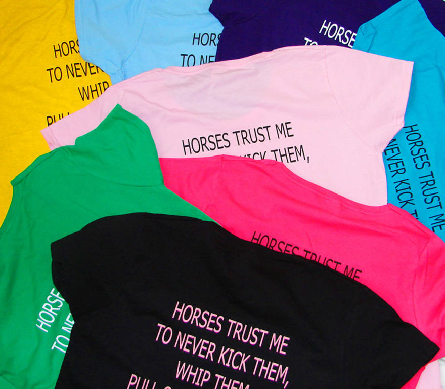 Text says: HORSES TRUST ME TO NEVER KICK THEM, WHIP THEM, PULL ON THEIR MOUTHS, KILL THEM OR EAT THEM